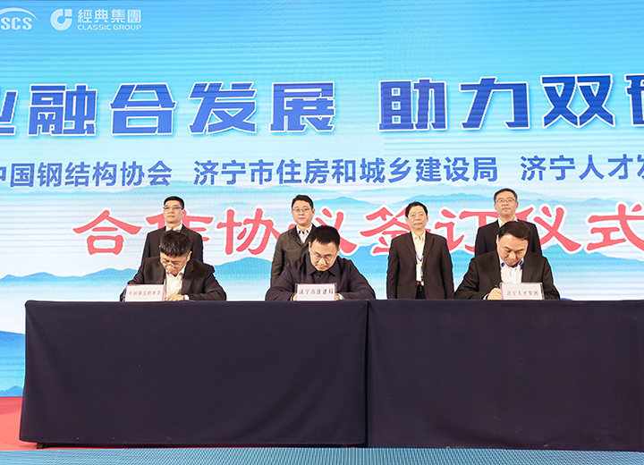 中國鋼結(jié)構(gòu)協(xié)會、濟(jì)寧市住房和城鄉(xiāng)建設(shè)局、濟(jì)寧人才發(fā)展集團(tuán)三方人才合作簽約儀式。