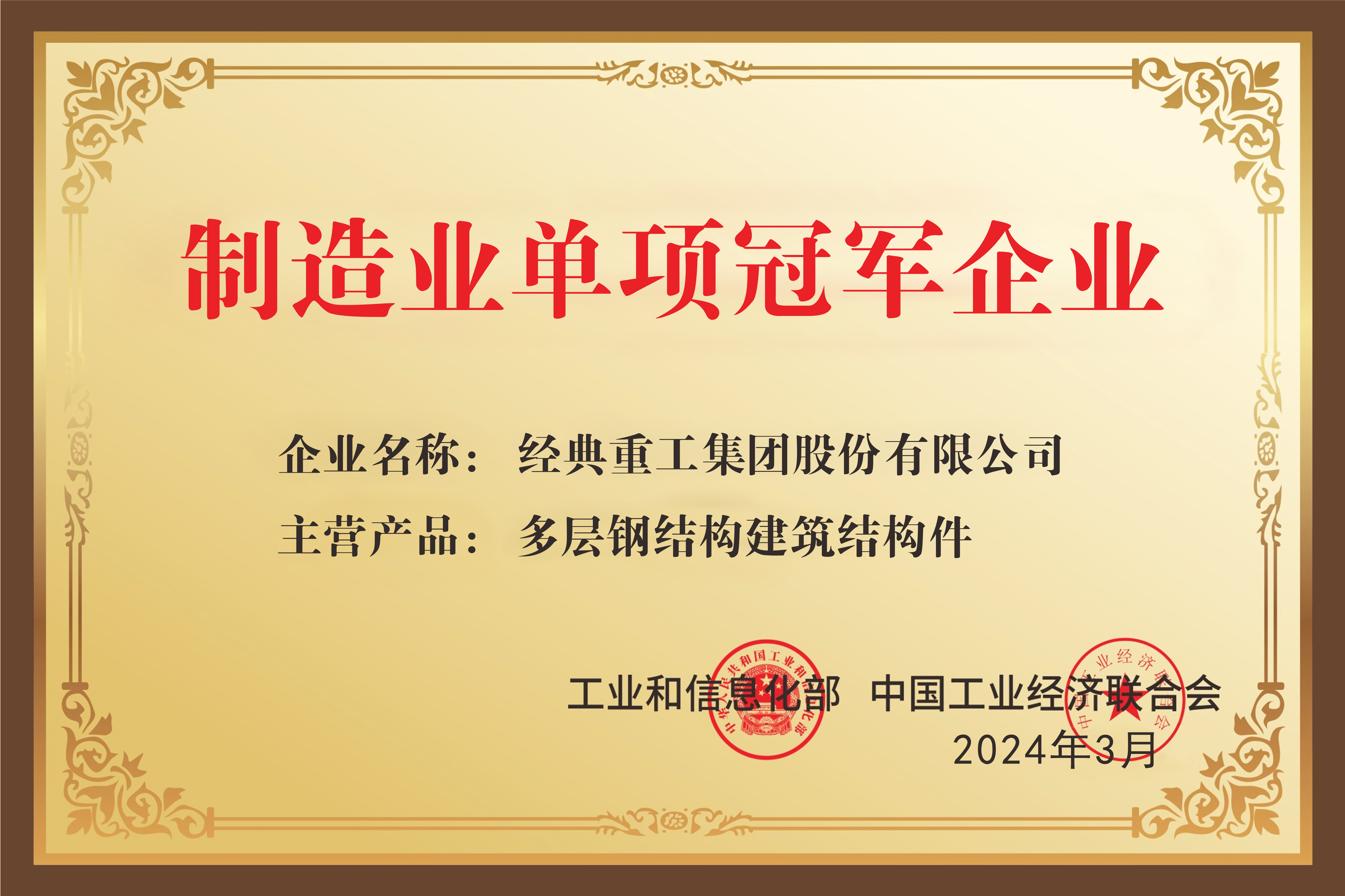 經(jīng)典集團(tuán)榮獲“國家級制造業(yè)單項冠軍示范企業(yè)”稱號。