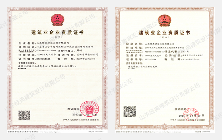 山東經(jīng)典建設(shè)工程有限公司始建于2001年,經(jīng)典集團(tuán)全資子公司。位于古九州之一的兗州境內(nèi),在傳承中華民族傳統(tǒng)建筑工藝的基礎(chǔ)上經(jīng)過(guò)不斷的創(chuàng)新發(fā)展,公司現(xiàn)已具備承建現(xiàn)代城市綜合建設(shè)、公用設(shè)施、大型鋼結(jié)構(gòu)工業(yè)廠房、鋼框架結(jié)構(gòu)辦公、商務(wù)、住宅等多種工程的承建能力。