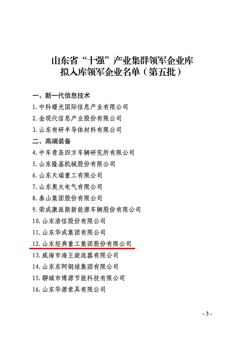 6月19日,山東省新舊動能轉換綜合試驗區建設領導小組辦公室發布了《關于公布山東省“十強”產業集群領軍企業名單(第五批)的通知》(魯動能辦【2023】16號),山東經典重工集團股份有限公司成功入選山東省“十強“產業集群領軍企業名單。
